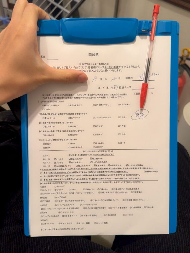 (風俗に行きまくるために射精ペースを抑えるために)私が事前の問診票でフィニッシュの項目に「発射はなしでお願いします」と書いていました。当然、そんなお客さんはなかなかおらずで「何しにきたの?」と思わせてしまい、最初だけ少し疑念を生んでしまって微妙な空気感にしてしまいました。もう終わったと思いましたね。。ですがきらりさんもだんだんと理解を示してくれてコミュニケーションの中でこちらのニーズを引き出してくれ、寛容さがあり優しいお姉さんでした。余裕があって頼れるようなまさにプチベテラン看護師さんといった印象で、B評価とさせていただきました。素人感はあまりなく、いい意味でプロです。